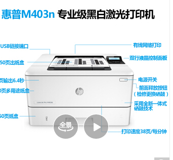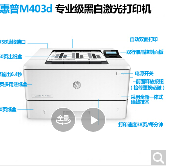商品名称:惠普(HP) LaserJet Pro M403DN/M403d/403n/403dw黑白激光打印机 HP M403N有线网络(401n升级版)