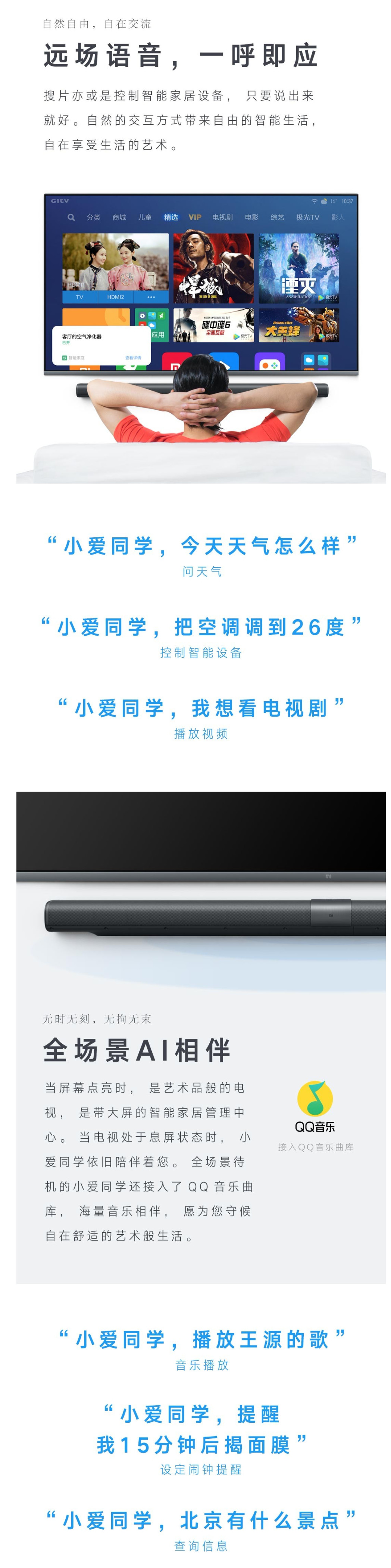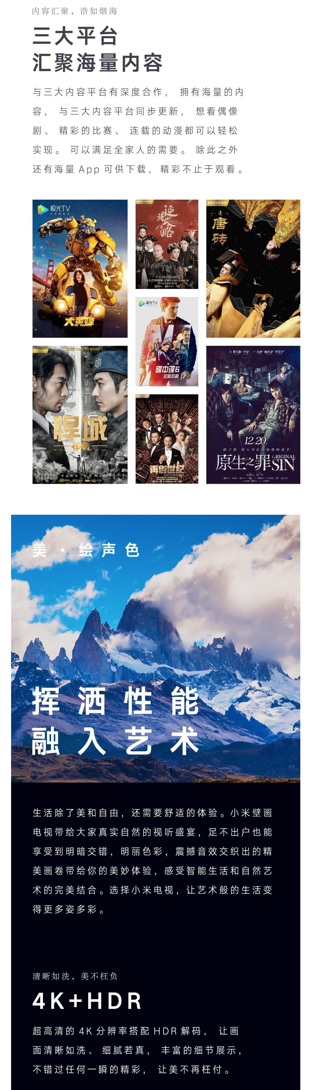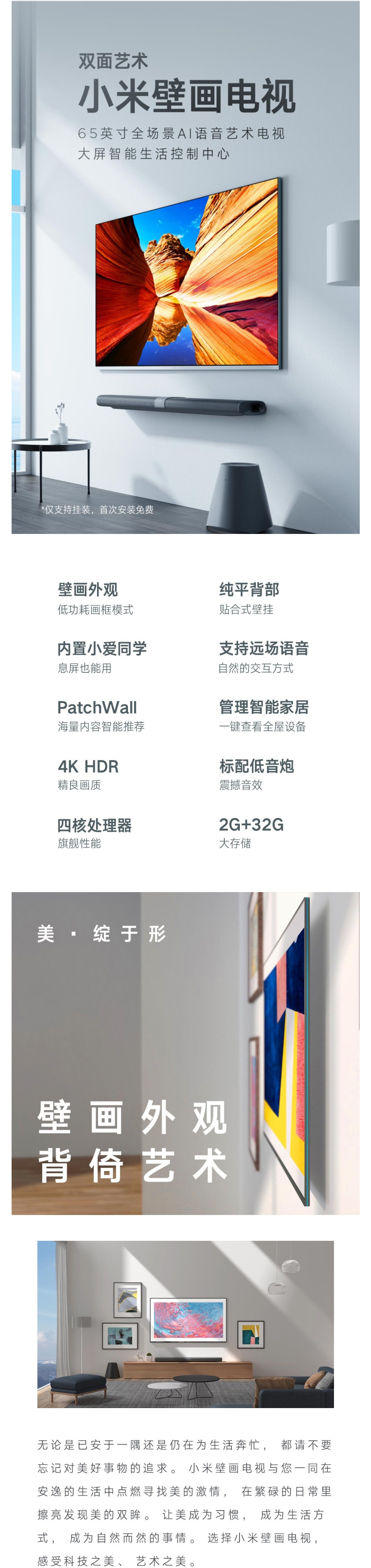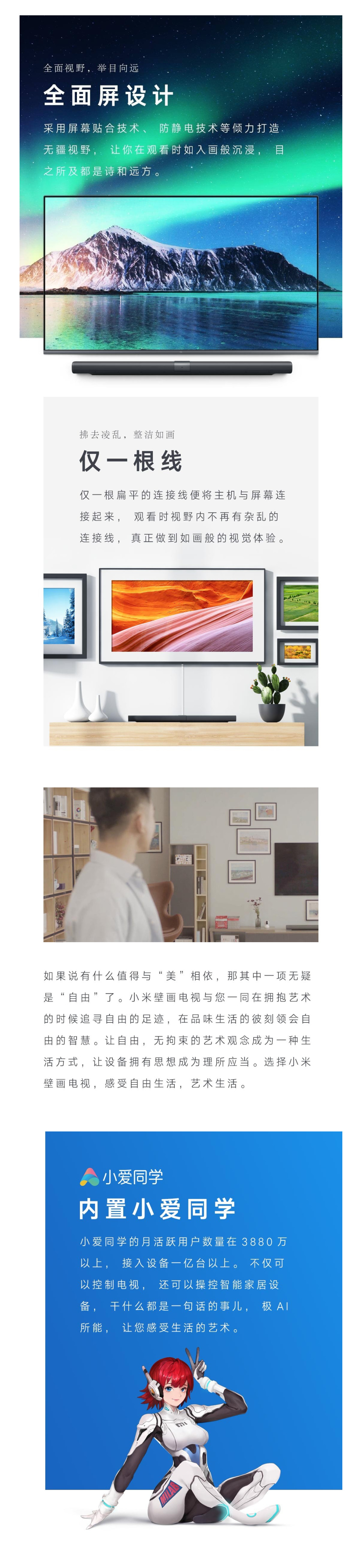• 商品名称:小米壁画电视65英寸2+32GHDR4K超高清人工智能语音液晶平板电视 65英寸壁画
